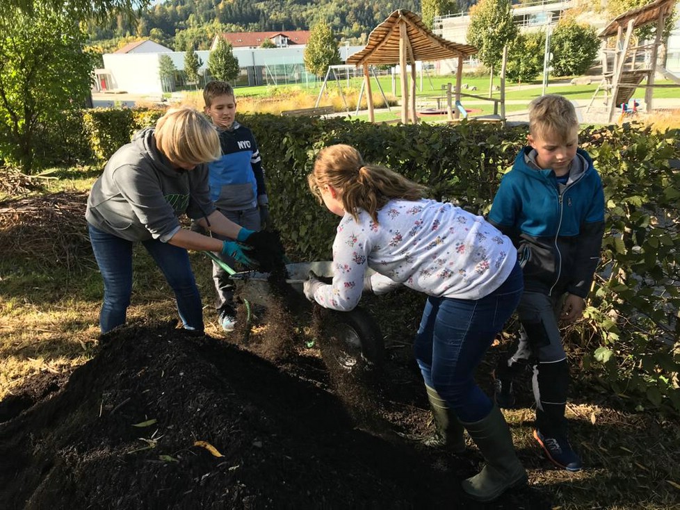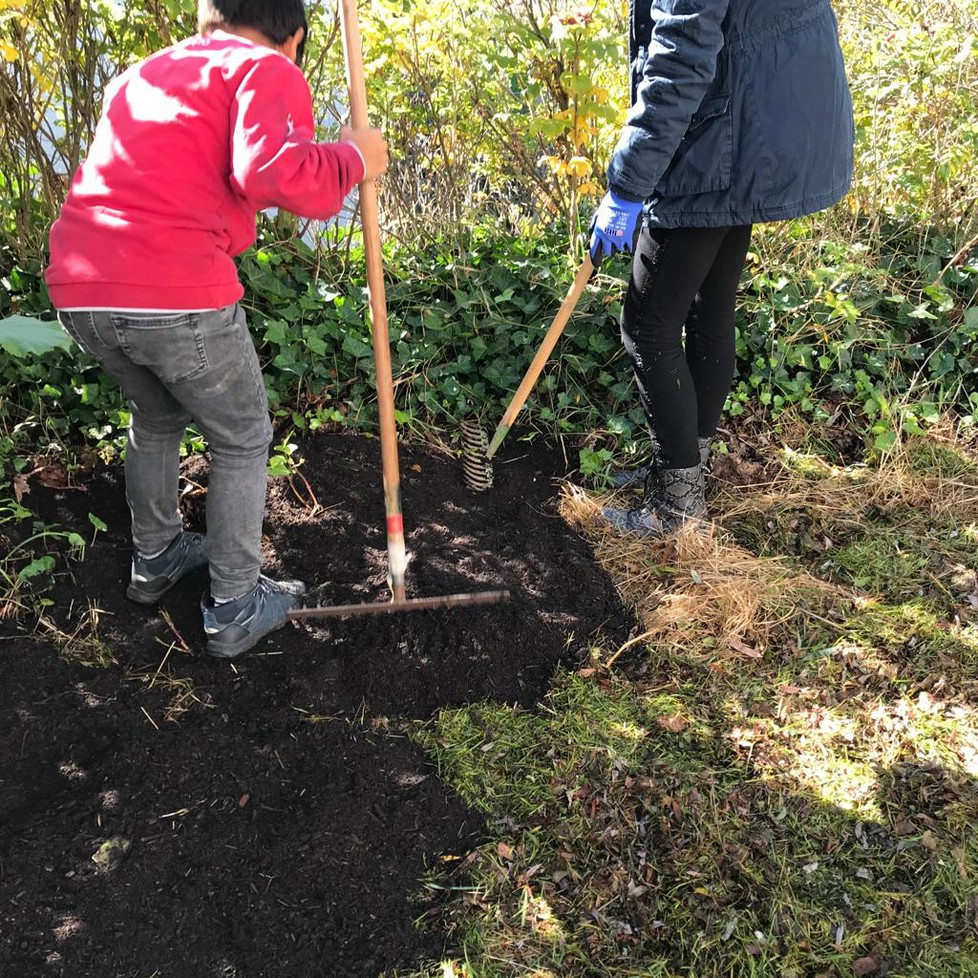 Im September fanden sich neue, begeisterte Junggärtner zusammen um das Werk ihrer Vorgänger fortzusetzen. Die beiden vorhandenen Beete wurden mit Humus aufgefüllt und ein neues rundes Beet angelegt. Bis zum erneuten Eintreten weiterer Maßnahmen verarbeiteten die 20 Kinder aus Klasse 4a/4b der Garten-AG 2m³ Humus. Als die Schüler der Klassen in a und b getrennt unterrichtet werden mussten, arbeitete die eine Gruppe weiter fleißig im Garten und konnte letzte Woche das neue Rundbeet fertigstellen, nicht ohne zuvor in den anderen Beeten weitere Erde aufzufüllen, als Gründüngung Senfsaat einzubringen (die jetzt schon schön aufgegangen ist und dem Boden den erforderlichen Winterschutz bietet) und noch einige Blumenzwiebeln zu stecken. Weitere 2m³ Erde wurden dazu von emsigen Händen mit Eimern, Schaufeln und Schubkarren verteilt.