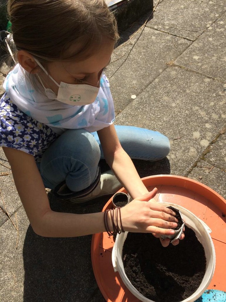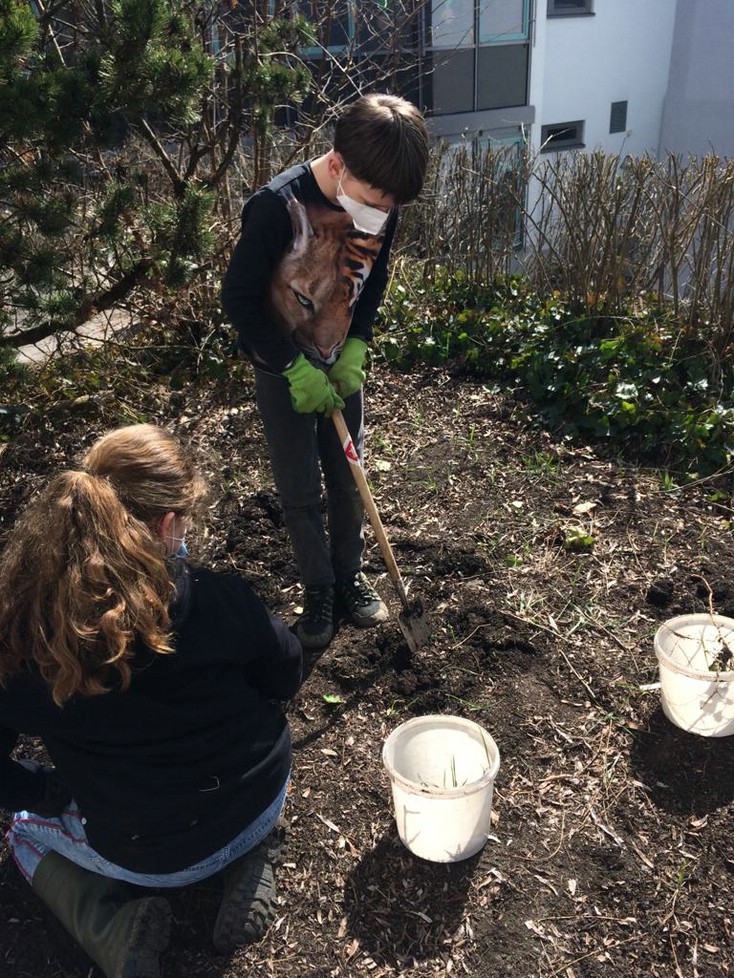 Als die neuen Kinder der Garten-AG zu Beginn des Schuljahres, (coronabedingt im zweiten Anlauf) den Schulgarten weiter gestalteten, mussten zuerst 3 cbm Erde an die richtigen Stellen verteilt werden. Mit Schubkarre, Schaufeln und Eimern wurden die Berge Schritt für Schritt an die richtigen Stellen umgesetzt und ein weiteres Rundbeet vorbereitet. Im November konnten dann die Blumenzwiebeln in die Erde gesteckt werden. Seit Wochen erfreuen sie uns nun mit ihren Blüten.