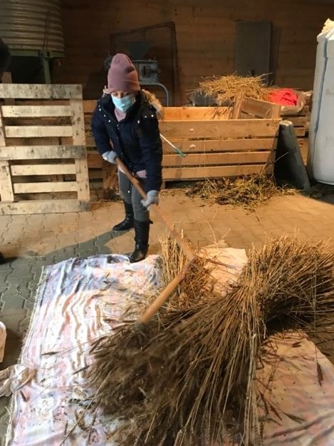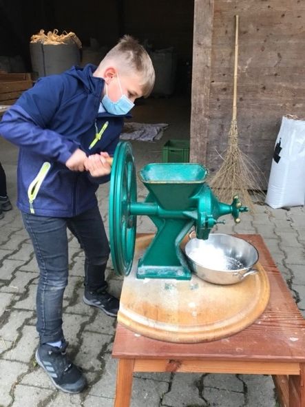 Zudem konnten wir testen wie man mit dem Dreschflegel die Körner von den Spelzen trennt. Danach nahmen wir die Körner und Spelzen in die Hand und pusteten. Da die Spelzen leichter waren als die Körner flogen die Spelzen weg und die Körner blieben auf der Hand zurück. Schon waren Körner und Spelzen getrennt.