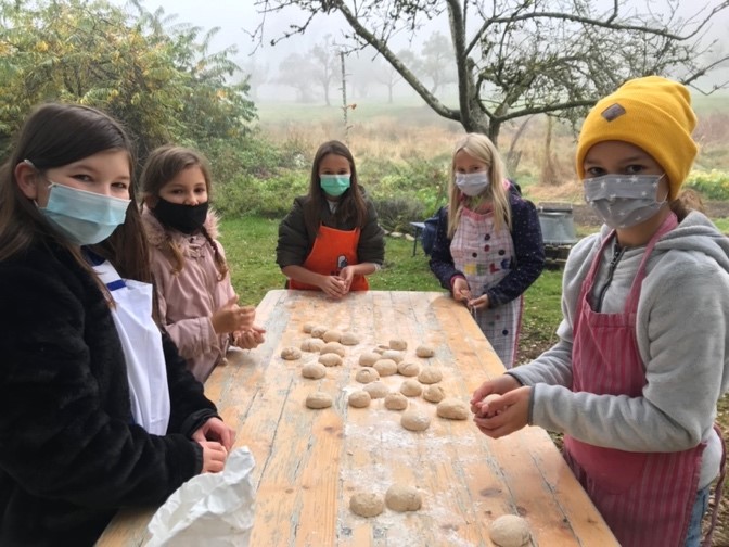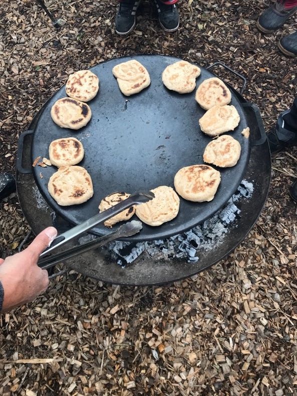 Danach gingen wir wieder in den Traumgarten zurück. Dort haben wir Gemüse geschnitten und den Teig zu kleinen Kugeln geknetet. Im Anschluss haben wir die Kugeln zu kleinen Fladenbroten gedrückt bevor diese auf einer Muurikka über dem Feuer von Frau Ostermayer gebacken wurden. Am Ende haben wir die warmen Fladenbrote mit Gemüse und Frischkäse belegt und ließen es uns schmecken. Dazu gab ich noch warmen Apfelpunsch.