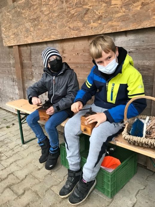 Anschließend haben wir ausprobiert wie es früher war Mehl zu mahlen: mit der Kaffeemühle, mit der Schwungmühle, mit dem Mörser und mit ganz normalen Steinen. Das selbst gemahlene Mehl durften wir später mit nach Hause nehmen.