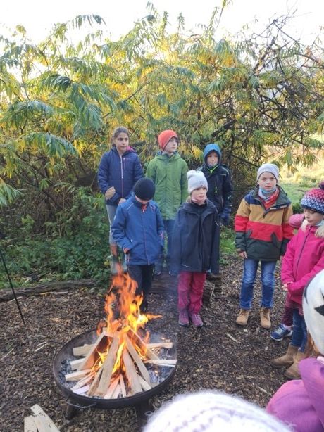 Zur Stärkung haben wir erst im Traumgarten in der Jurte gevespert. Danach haben wir ein Feuer in der Feuerschale gemacht, auf dem wir später unsere Fladenbrote backen konnten.