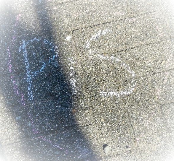 In den Pausen wurde auch der Schulhof zum Ausdruck des Wunsches nach Frieden. Mit Straßenkreiden haben die Schüler Friedenszeichen, Friedenstauben, Regenbögen etc. auf den Boden gemalt. Ein Erstklässler versuchte sich in der englischen Sprache und verlieh seinem Wunsch lautgetreu Ausdruck.