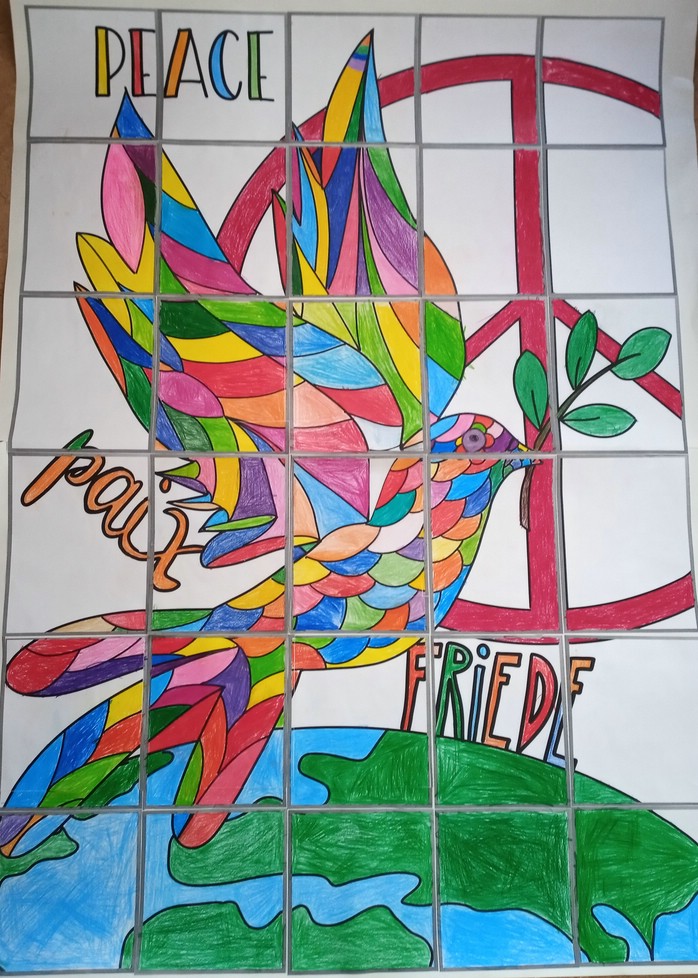 Zudem haben einige Klassen der Auentalschule gemeinsam Friedensplakate angemalt. Diese großen Gemeinschaftswerke sind nun am Eingang der Schule, in verschiedenen Fenstern und eines sogar im Rathaus zu bewundern.