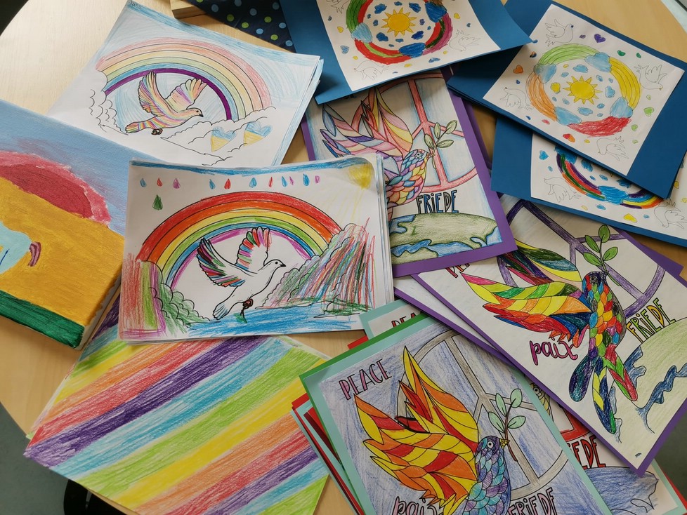 Die aktuelle weltpolitische Lage geht in diesen Tagen auch an den Kindern nicht spurlos vorüber. Behutsam und kindgerecht wird diesem Thema daher auch im Unterricht Raum gegeben. Als gemeinsames Zeichen der Solidarität haben alle Klassen Friedentauben gebastelt, die nun die Fenster der Auentalschule zieren. Einige Schüler haben darüber hinaus Bilder gemalt, die dem Aktionsbündnis „ÜB hilft“ übergeben wurden. Das Team dieser Hilfsorganisation legt die Bilder in Spendenkartons, so dass die bunten Kunstwerke den betroffenen Menschen in den Krisengebieten vielleicht für einen kurzen Moment ein Lächeln ins Gesicht zaubern können.