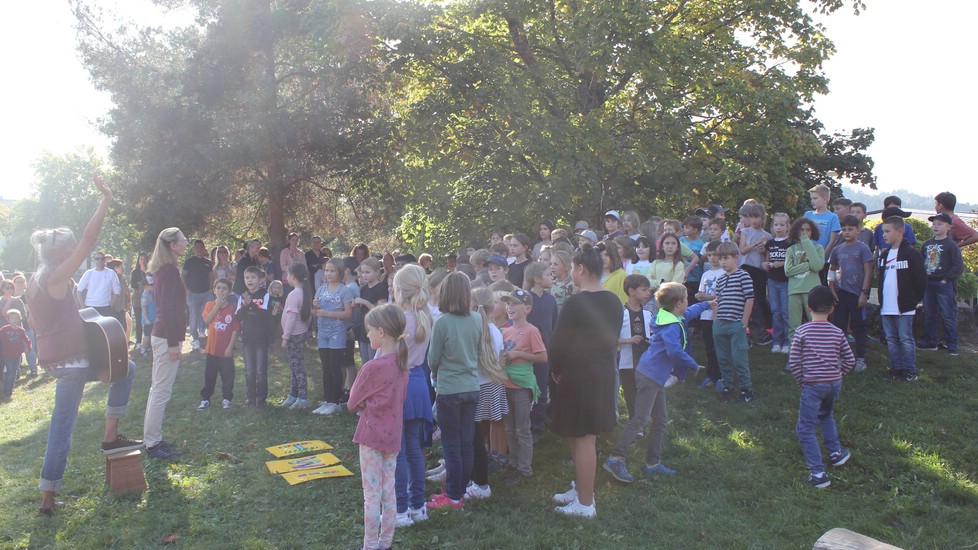 Zunächst begrüßten alle Kinder mit einem eigens für das Schulfest getexteten Lied alle Anwesenden. Anschließend sang der Chor das Lied „Sur le pont“ in zwei Sprachen. Denn mit diesem Schulfest wurde die Kooperation der Auentalschule mit dem Deutsch-Französichen Verein besiegelt. Nach einer kurzen Ansprache durch die Schulleiterin Kerstin Pegels begrüßte auch Frau Evelin Veitinger im Namen des Vereins die Gäste.
