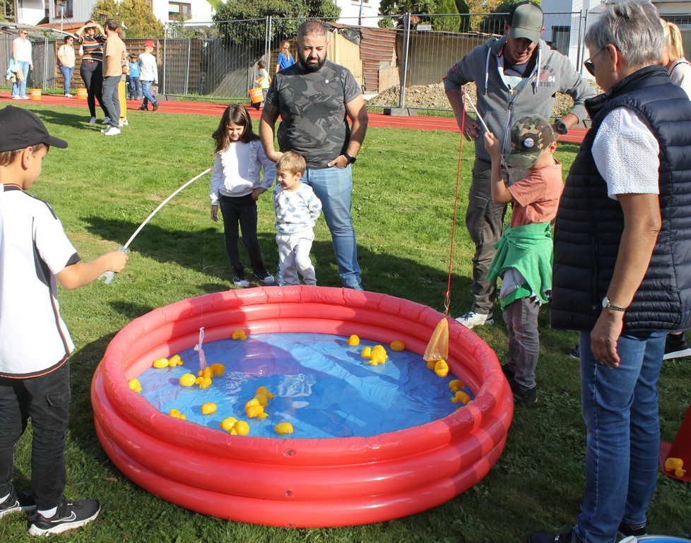 Mit dem gemeinsamen Bewegungslied „Theo, Theo“ konnte es dann losgehen. Nach Herzenslust konnten die Kinder spielen. Denn bei diesem Fest stand nur eine Sache im Vordergrund: spielen und Spaß haben! So wurden von den Lehrerinnen die verschiedensten Spielstationen angeboten: Edelstein suchen in der Sandgrube, Fallschirm basteln, Bälle filzen, Sackhüpfen, Tauziehen, Enten angeln, Wasser tragen, Dosen werfen, Shuffle Board und Kinder schminken. Viele weitere Spielmöglichkeiten wie Minigolf, Rhönrad und Riesenmikado waren durch das Spielmobil geboten, das der Elternbeirat für das Fest bereitgestellt hatte.