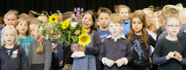 Nach Glückwünschen des Schulamtsdirektors folgte ein Beitrag der Schülerschaft. Mit einem Lied der „Höhner“, der Lieblingsband Kerstin Pegels, brachten die Kinder nicht nur eine beschwingte Stimmung in die Veranstaltung, sondern auch ein großes Lächeln auf das Gesicht der neuen Rektorin. Nicht zu vergessen auch der wunderschöne Anblick der Schülerschar: als besondere Überraschung kamen alle Auentalschüler und Lehrer in blau gekleidet, der Lieblingsfarbe der neuen Schulleiterin.