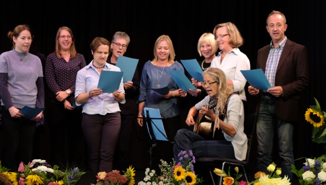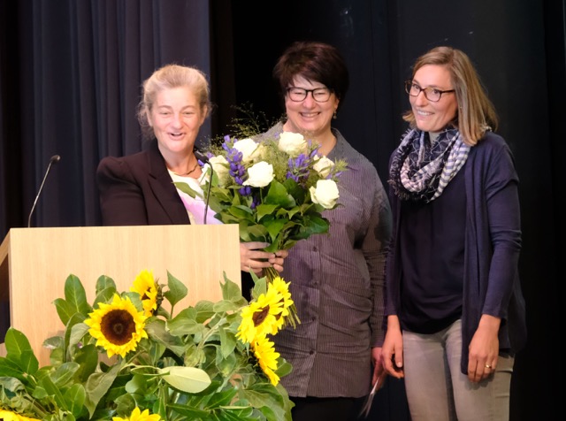Martina Wolf und Juliane Kramm übernahmen die Grußworte des Kollegiums. Auch hier zeigte sich einmal mehr, wie glücklich und zuversichtlich alle Beteiligten über die Amtseinsetzung der neuen Rektorin sind. Mit dem Lied „Wenn nicht jetzt, wann dann“, mit einem eigens für Kerstin Pegels geschriebenen Text und einem Geschenk bedankte sich das Kollegium für die geleistete Arbeit und den neuen Schwung in der Auentalschule, sowie für die Bereitschaft von Frau Pegels, die Schulleitung zu übernehmen.