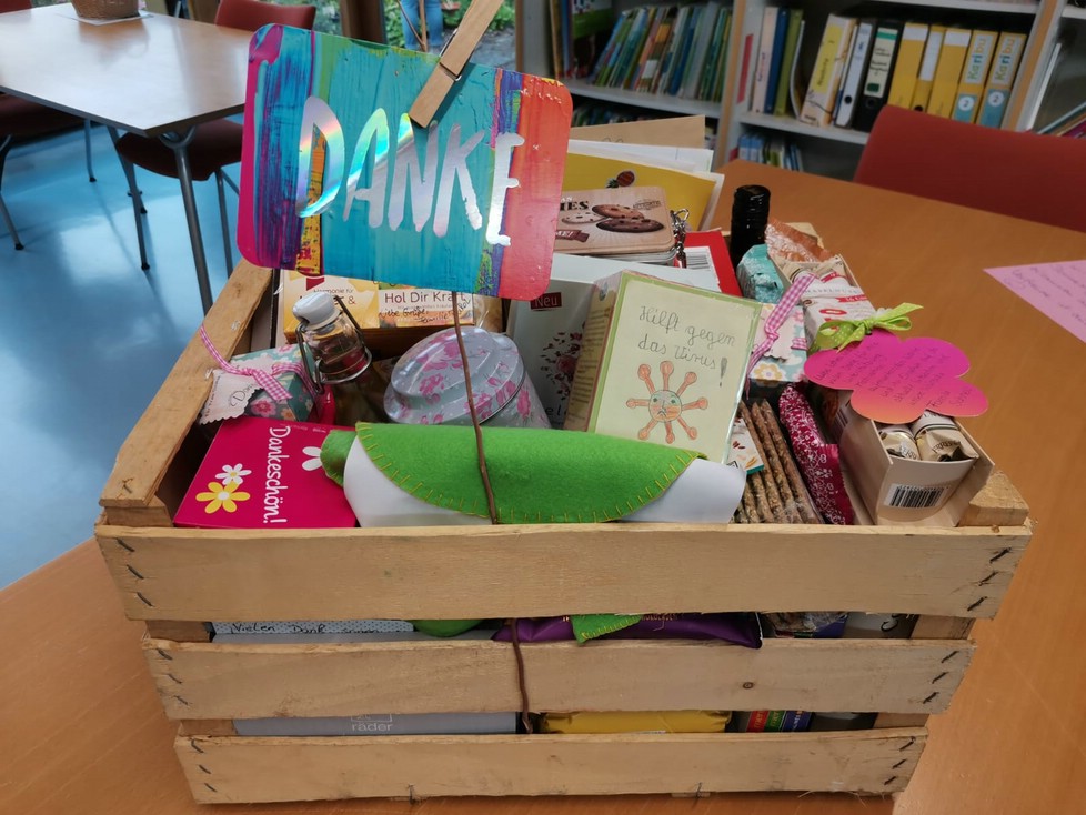 Am Mittwochmorgen stand eine „Kiste der Anerkennung“ vor der Tür des Lehrerzimmers: eine riesige Kiste voller guter Leckereien. Liebevoll gepackt und mit persönlichen Worten versehen fand sich für jeden etwas nach seinem Geschmack…